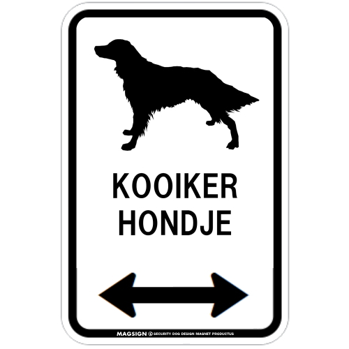 英語犬種名【KOOIKERHONDJE】とシルエットが入ったユニークなデザインのマグネットサイン、道路標識のような両方向矢印⇔が「ここはコーイケルホンディエがいるんだ」とわかりやすく、愛犬アピールや注意喚起をセンスよくお知らせ。