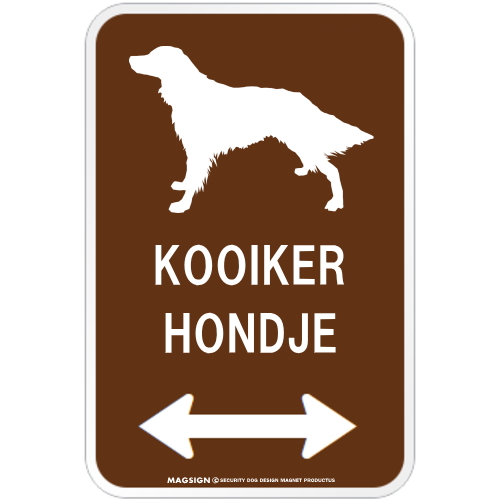 英語犬種名【KOOIKERHONDJE】とシルエットが入ったユニークなデザインのマグネットサイン、道路標識のような両方向矢印⇔が「ここはコーイケルホンディエがいるんだ」とわかりやすく、愛犬アピールや注意喚起をセンスよくお知らせ。