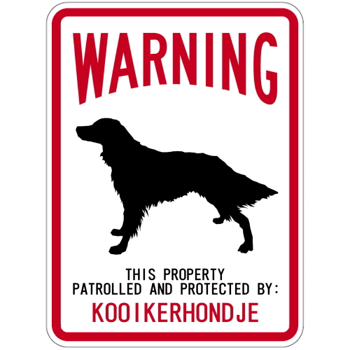 WARNING THIS PROPERTY PATROLLED AND PROTECTED BY: KOOIKERHONDJE(警告!この資産はコーイケルホンディエにより警戒および保護されています)って英語で書いた、外国人にもよくわかるユーモアとセンス満点のマグサイン。白地に四角い赤枠と上部にブリッジ型にレイアウトされた【WARNING】が、いかにもアメリカンでカッコよく「ここは犬がいるんだ」と一目瞭然、犬注意や警戒中で防犯にわかりやすくてピッタリだね。