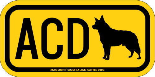 オーストラリアンキャトルドッグのシルエットとイニシャル3文字(英語犬種名の頭文字や子音)をつづったマグネット&ステッカー。3つのアルファベットの並び方がまるで、救助犬・捜査犬・探知犬といった組織や団体で活躍する犬用アイディ(ID)。大きな文字やイラストに黄色と黒の配色はとても見栄えが良く、周囲への愛犬認識にわかりやすいデザインです。