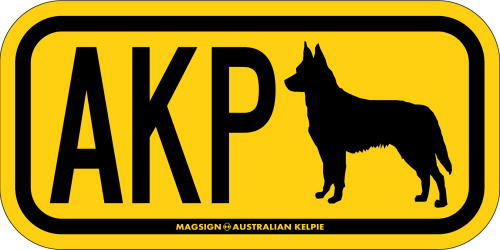 オーストラリアンケルピーのシルエットとイニシャル3文字(英語犬種名の頭文字や子音)をつづったマグネット&ステッカー。3つのアルファベットの並び方がまるで、救助犬・捜査犬・探知犬といった組織や団体で活躍する犬用アイディ(ID)。大きな文字やイラストに黄色と黒の配色はとても見栄えが良く、周囲への愛犬認識にわかりやすいデザインです。
