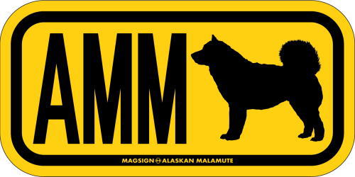 アラスカンマラミュートのシルエットとイニシャル3文字(英語犬種名の頭文字や子音)をつづったマグネット&ステッカー。3つのアルファベットの並び方がまるで、救助犬・捜査犬・探知犬といった組織や団体で活躍する犬用アイディ(ID)。大きな文字やイラストに黄色と黒の配色はとても見栄えが良く、周囲への愛犬認識にわかりやすいデザインです。
