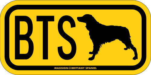 ブリタニースパニエルのシルエットとイニシャル3文字(英語犬種名の頭文字や子音)をつづったマグネット&ステッカー。3つのアルファベットの並び方がまるで、救助犬・捜査犬・探知犬といった組織や団体で活躍する犬用アイディ(ID)。大きな文字やイラストに黄色と黒の配色はとても見栄えが良く、周囲への愛犬認識にわかりやすいデザインです。