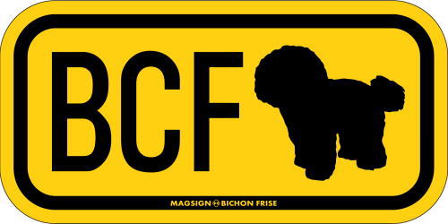 ビションフリーゼのシルエットとイニシャル3文字(英語犬種名の頭文字や子音)をつづったマグネット&ステッカー。3つのアルファベットの並び方がまるで、救助犬・捜査犬・探知犬といった組織や団体で活躍する犬用アイディ(ID)。大きな文字やイラストに黄色と黒の配色はとても見栄えが良く、周囲への愛犬認識にわかりやすいデザインです。