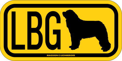 レオンベルガーのシルエットとイニシャル3文字(英語犬種名の頭文字や子音)をつづったマグネット&ステッカー。3つのアルファベットの並び方がまるで、救助犬・捜査犬・探知犬といった組織や団体で活躍する犬用アイディ(ID)。大きな文字やイラストに黄色と黒の配色はとても見栄えが良く、周囲への愛犬認識にわかりやすいデザインです。