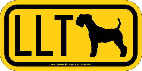 レイクランドテリアのシルエットとイニシャル3文字(英語犬種名の頭文字や子音)をつづったマグネット&ステッカー。3つのアルファベットの並び方がまるで、救助犬・捜査犬・探知犬といった組織や団体で活躍する犬用アイディ(ID)。大きな文字やイラストに黄色と黒の配色はとても見栄えが良く、周囲への愛犬認識にわかりやすいデザインです。