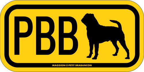 プチブラバンソンのシルエットとイニシャル3文字(英語犬種名の頭文字や子音)をつづったマグネット&ステッカー。3つのアルファベットの並び方がまるで、救助犬・捜査犬・探知犬といった組織や団体で活躍する犬用アイディ(ID)。大きな文字やイラストに黄色と黒の配色はとても見栄えが良く、周囲への愛犬認識にわかりやすいデザインです。