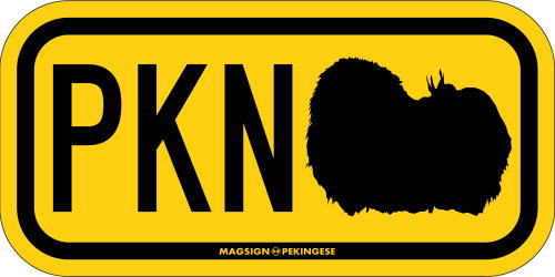 ペキニーズのシルエットとイニシャル3文字(英語犬種名の頭文字や子音)をつづったマグネット&ステッカー。3つのアルファベットの並び方がまるで、救助犬・捜査犬・探知犬といった組織や団体で活躍する犬用アイディ(ID)。大きな文字やイラストに黄色と黒の配色はとても見栄えが良く、周囲への愛犬認識にわかりやすいデザインです。