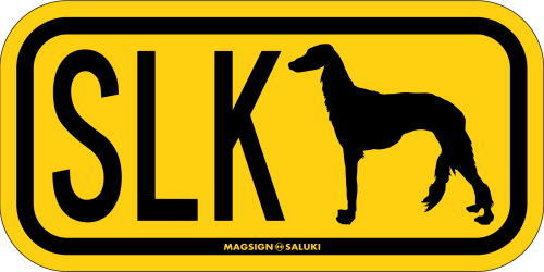 サルーキのシルエットとイニシャル3文字(英語犬種名の頭文字や子音)をつづったマグネット&ステッカー。3つのアルファベットの並び方がまるで、救助犬・捜査犬・探知犬といった組織や団体で活躍する犬用アイディ(ID)。大きな文字やイラストに黄色と黒の配色はとても見栄えが良く、周囲への愛犬認識にわかりやすいデザインです。