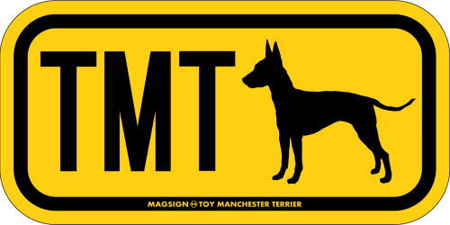 トイマンチェスターテリアのシルエットとイニシャル3文字(英語犬種名の頭文字や子音)をつづったマグネット&ステッカー。3つのアルファベットの並び方がまるで、救助犬・捜査犬・探知犬といった組織や団体で活躍する犬用アイディ(ID)。大きな文字やイラストに黄色と黒の配色はとても見栄えが良く、周囲への愛犬認識にわかりやすいデザインです。
