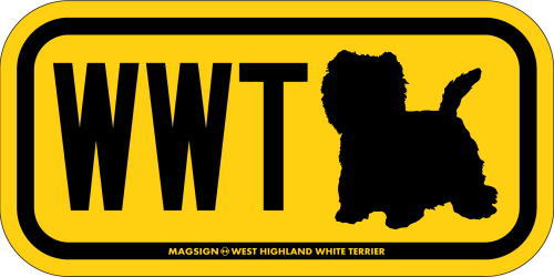 ウエストハイランドホワイトテリアのシルエットとイニシャル3文字(英語犬種名の頭文字や子音)をつづったマグネット&ステッカー。3つのアルファベットの並び方がまるで、救助犬・捜査犬・探知犬といった組織や団体で活躍する犬用アイディ(ID)。大きな文字やイラストに黄色と黒の配色はとても見栄えが良く、周囲への愛犬認識にわかりやすいデザインです。