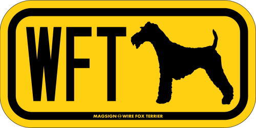 ワイヤーフォックステリアのシルエットとイニシャル3文字(英語犬種名の頭文字や子音)をつづったマグネット&ステッカー。3つのアルファベットの並び方がまるで、救助犬・捜査犬・探知犬といった組織や団体で活躍する犬用アイディ(ID)。大きな文字やイラストに黄色と黒の配色はとても見栄えが良く、周囲への愛犬認識にわかりやすいデザインです。