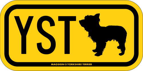ヨークシャーテリアのシルエットとイニシャル3文字(英語犬種名の頭文字や子音)をつづったマグネット&ステッカー。3つのアルファベットの並び方がまるで、救助犬・捜査犬・探知犬といった組織や団体で活躍する犬用アイディ(ID)。大きな文字やイラストに黄色と黒の配色はとても見栄えが良く、周囲への愛犬認識にわかりやすいデザインです。