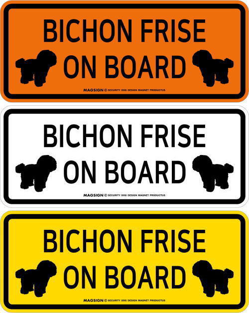 BICHON FRISE ON BOARD(ビションフリーゼ乗車中)の英語と、仲良く向かい合ったイラストが入ったカーマグネット&バンパーステッカー。2頭が左右からお互いに見合っているシルエットでフレンドリーに、愛犬のビションフリーゼが車に乗っていることを周囲にアピール♪