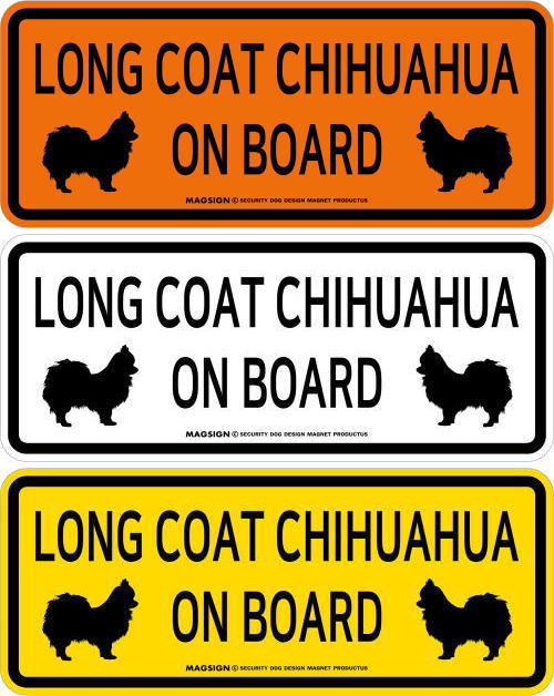 LONG COAT CHIHUAHUA ON BOARD(ロングコートチワワ乗車中)の英語と、仲良く向かい合ったイラストが入ったカーマグネット&バンパーステッカー。2頭が左右からお互いに見合っているシルエットでフレンドリーに、愛犬のロングコートチワワが車に乗っていることを周囲にアピール♪