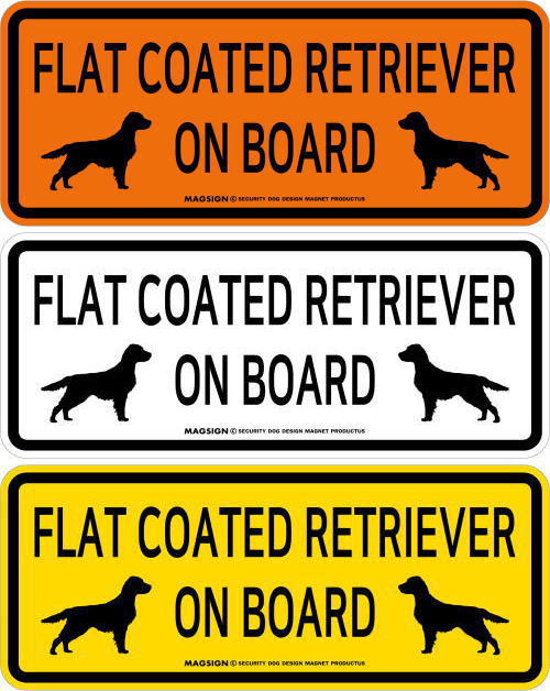 FLAT COATED RETRIEVER ON BOARD(フラットコーテッドレトリバー乗車中)の英語と、仲良く向かい合ったイラストが入ったカーマグネット&バンパーステッカー。2頭が左右からお互いに見合っているシルエットでフレンドリーに、愛犬のフラットコーテッドレトリバーが車に乗っていることを周囲にアピール♪