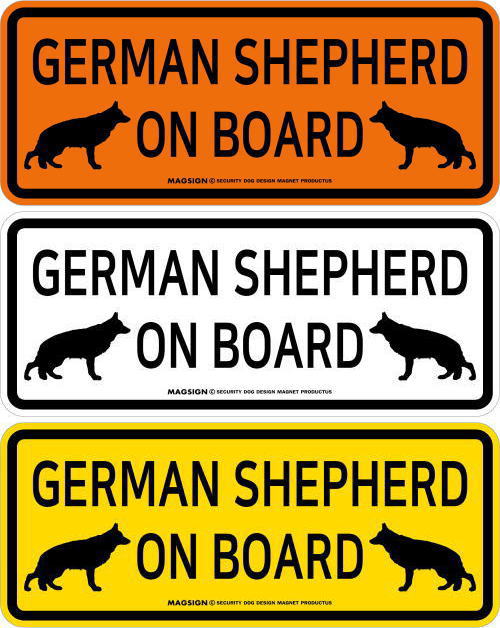 GERMAN SHEPHERD ON BOARD(ジャーマンシェパード乗車中)の英語と、仲良く向かい合ったイラストが入ったカーマグネット&バンパーステッカー。2頭が左右からお互いに見合っているシルエットでフレンドリーに、愛犬のジャーマンシェパードが車に乗っていることを周囲にアピール♪