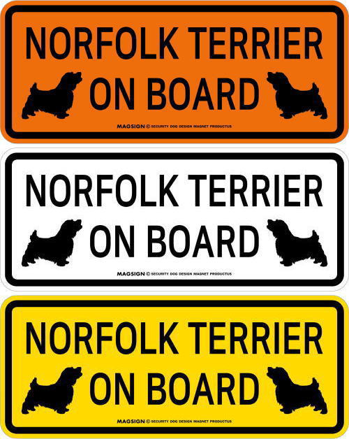 NORFOLK TERRIER ON BOARD(ノーフォークテリア乗車中)の英語と、仲良く向かい合ったイラストが入ったカーマグネット&バンパーステッカー。2頭が左右からお互いに見合っているシルエットでフレンドリーに、愛犬のノーフォークテリアが車に乗っていることを周囲にアピール♪