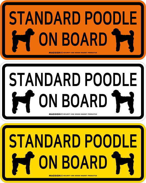 STANDARD POODLE ON BOARD(スタンダードプードル乗車中)の英語と、仲良く向かい合ったイラストが入ったカーマグネット&バンパーステッカー。2頭が左右からお互いに見合っているシルエットでフレンドリーに、愛犬のスタンダードプードルが車に乗っていることを周囲にアピール♪