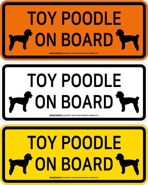 TOY POODLE ON BOARD(トイプードル乗車中)の英語と、仲良く向かい合ったイラストが入ったカーマグネット&バンパーステッカー。2頭が左右からお互いに見合っているシルエットでフレンドリーに、愛犬のトイプードルが車に乗っていることを周囲にアピール♪