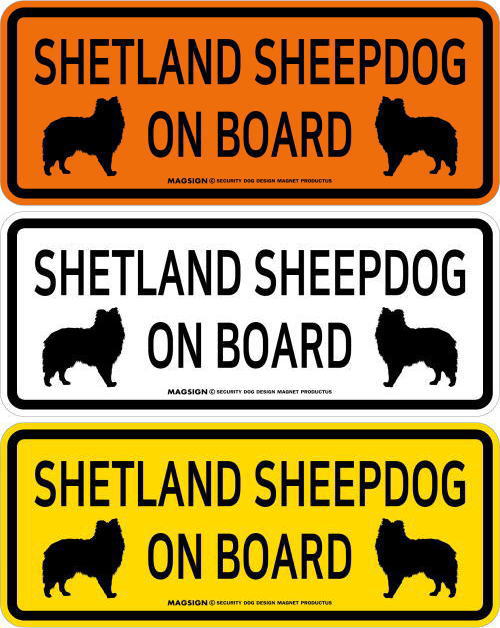 SHETLAND SHEEPDOG ON BOARD(シェットランドシープドッグ乗車中)の英語と、仲良く向かい合ったイラストが入ったカーマグネット&バンパーステッカー。2頭が左右からお互いに見合っているシルエットでフレンドリーに、愛犬のシェットランドシープドッグが車に乗っていることを周囲にアピール♪